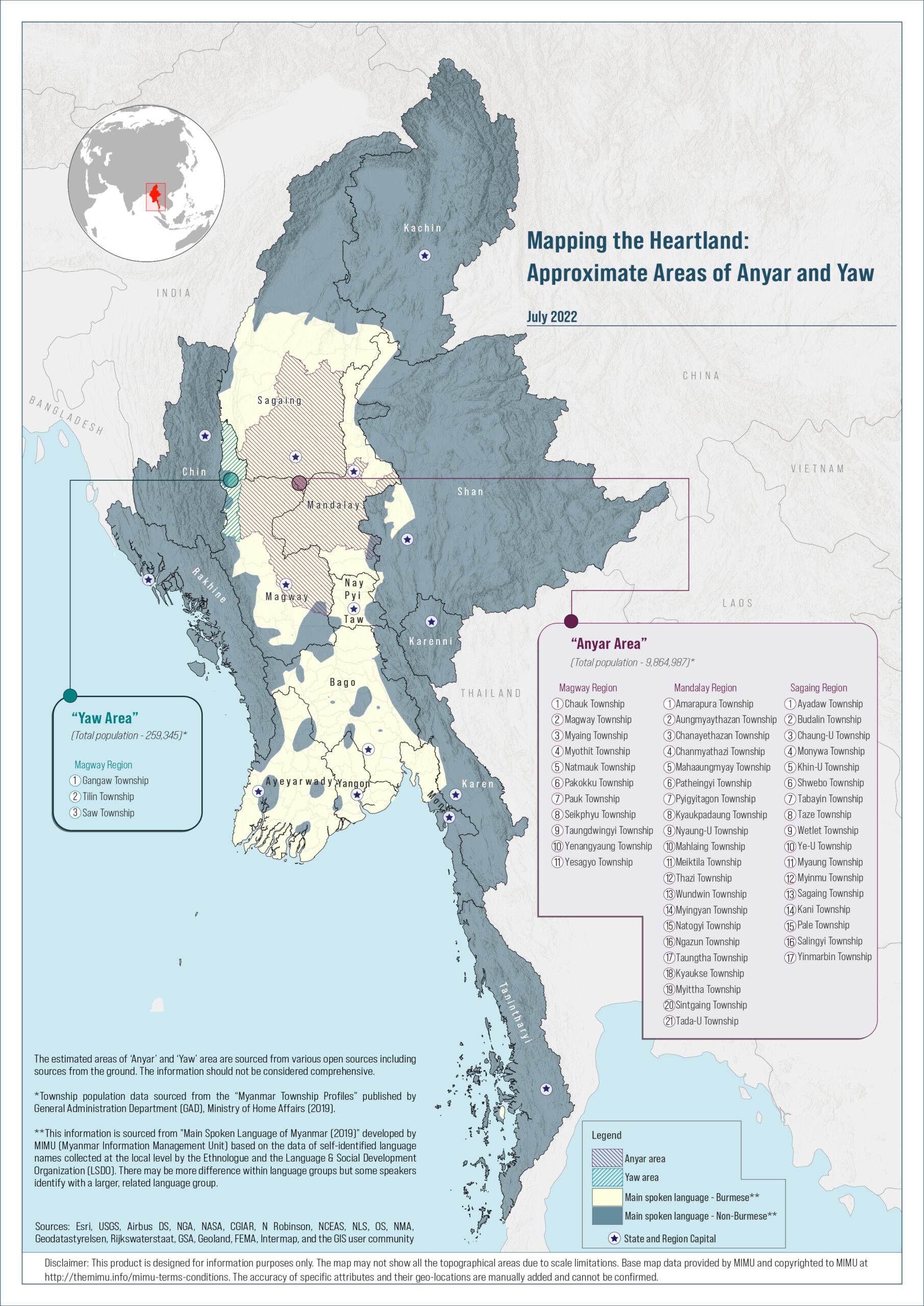 The focus of this paper is on the Myanmar heartland. Comprising the majority Bamar and Buddhist Sagaing, Magway, and Mandalay regions, this area holds a central space in the Myanmar military’s creation myth, which looks to ancient Burmese royalty for inspiration and alleged heritage. The military has touted the hegemony of the Bamar language and cultural practices as central to the notion of Myanmar identity, and has traced Myanmar’s national identity to historical origins among ancient and more recent settlements in the heartland. It has thereby prioritised recruitment from Bamar-majority areas, to include the heartland, and people from the heartland occupy prominent positions throughout its hierarchy.