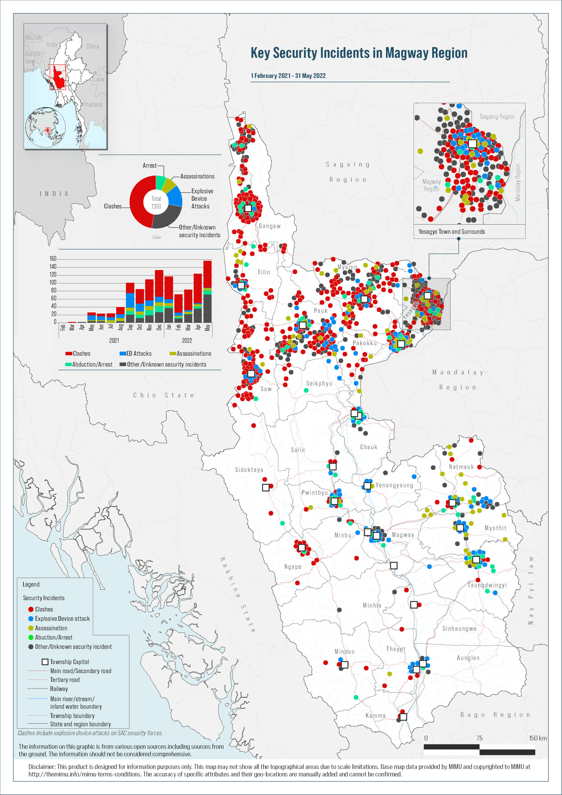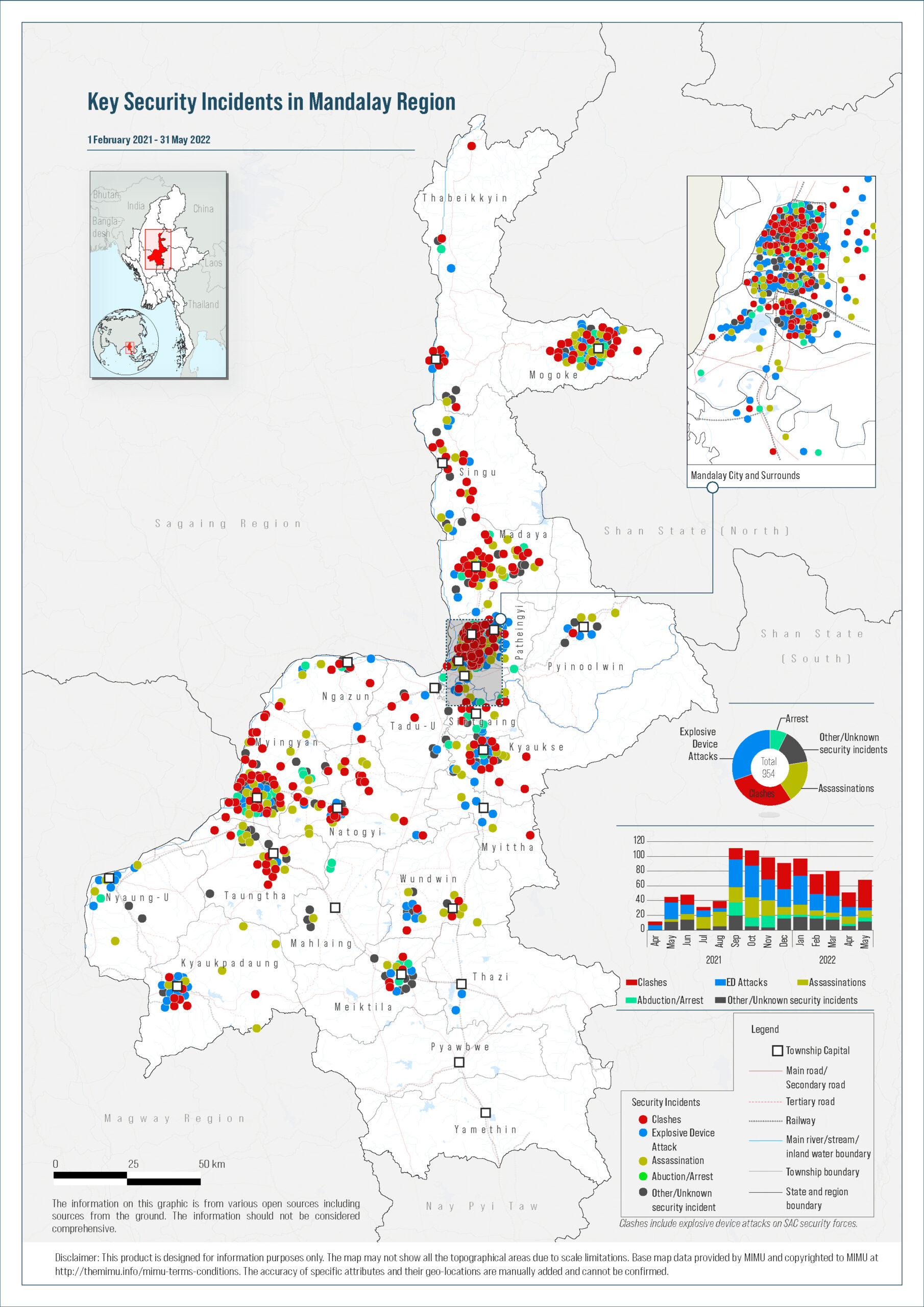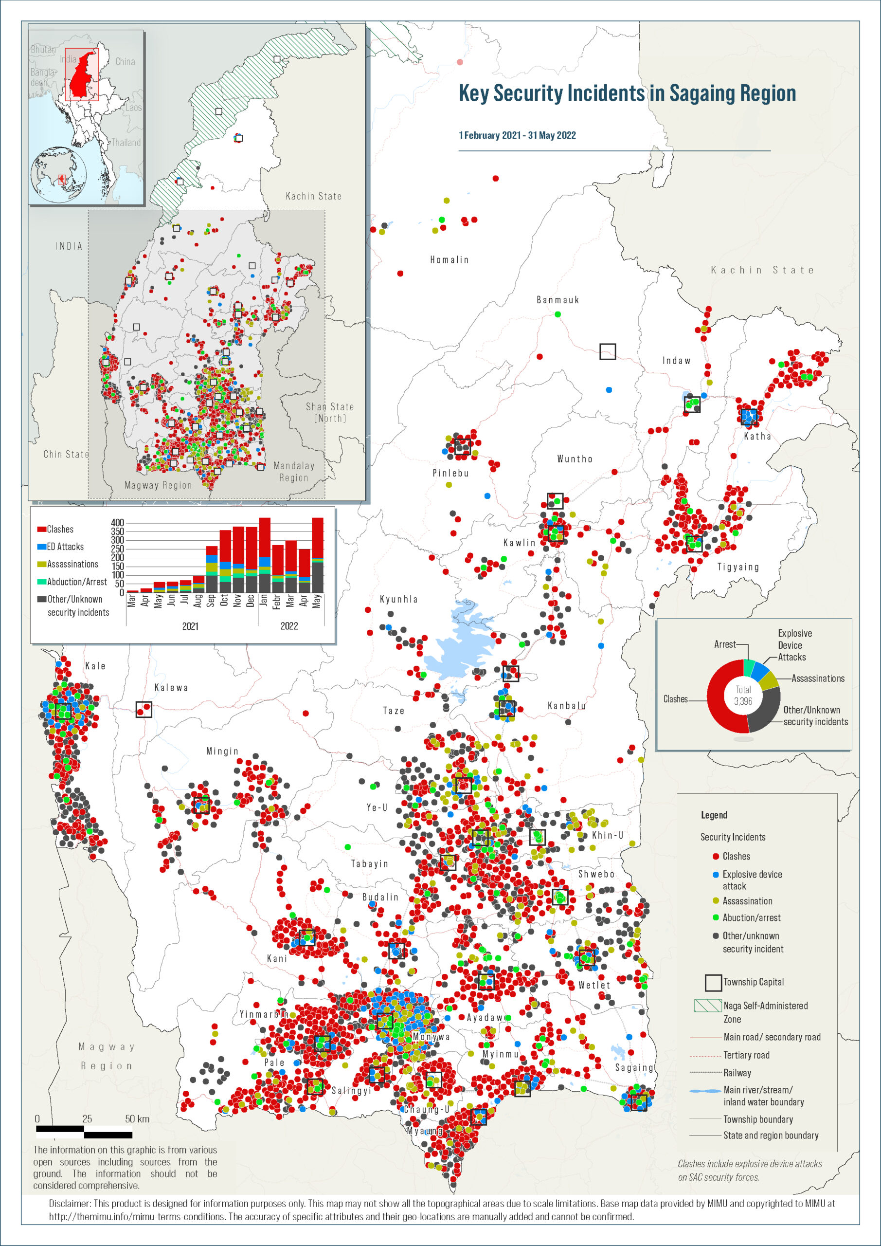 From 1 February 2021 to 31 May 2022, 4,818 security incidents involving anti-coup forces were identified across Myanmar. The highest number were in Sagaing Region, where 1,884 incidents took place, while Magway and Mandalay regions had the second and fourth highest number of incidents respectively.[30] It is striking that the frequency of incidents in the heartland is significantly more than in traditional borderland areas, where long-standing and well-equipped forces such as the KNLA and KIA continue to engage in armed conflict with the SAC. The armed activity and engagement of heartland PDFs has increased over time—despite the Myanmar military’s known capacity and tendency to perpetrate retaliatory acts of extreme violence,[31] including against communities where it believes PDF members are located[32]—suggesting conflict across the three regions will be neither short lived nor one sided.[33]