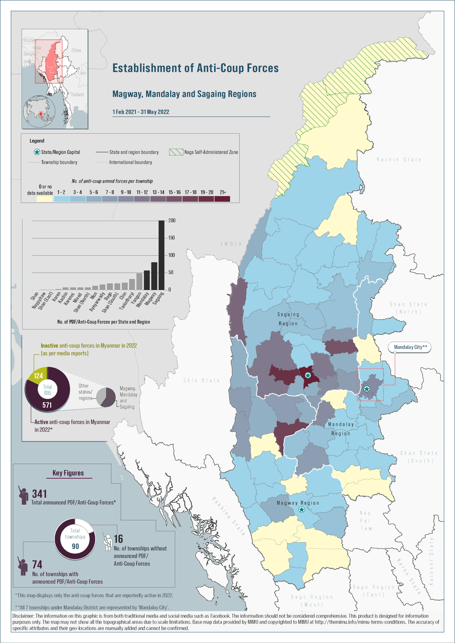 Prior to the February 2021 military coup, the ‘heartland’ regions of Sagaing, Magway, and Mandalay were among the more peaceful areas of Myanmar, with little organised armed violence to speak of. However, since the February 2021 coup, these regions have become the site of some of the most active anti-coup resistance activity in the country. Nonviolent resistance to the coup in these areas—met with military violence, arrests, and lethal force—has, over time, transformed into guerrilla-style attacks on military personnel and assets. The military has largely responded to such attacks by destroying entire villages it suspects of harbouring resistance fighters. Sagaing and Magway regions, in particular, now host some of the most intense armed conflict in the country, between State Administration Council (SAC) forces and a growing array of local People’s Defence Forces (PDFs).