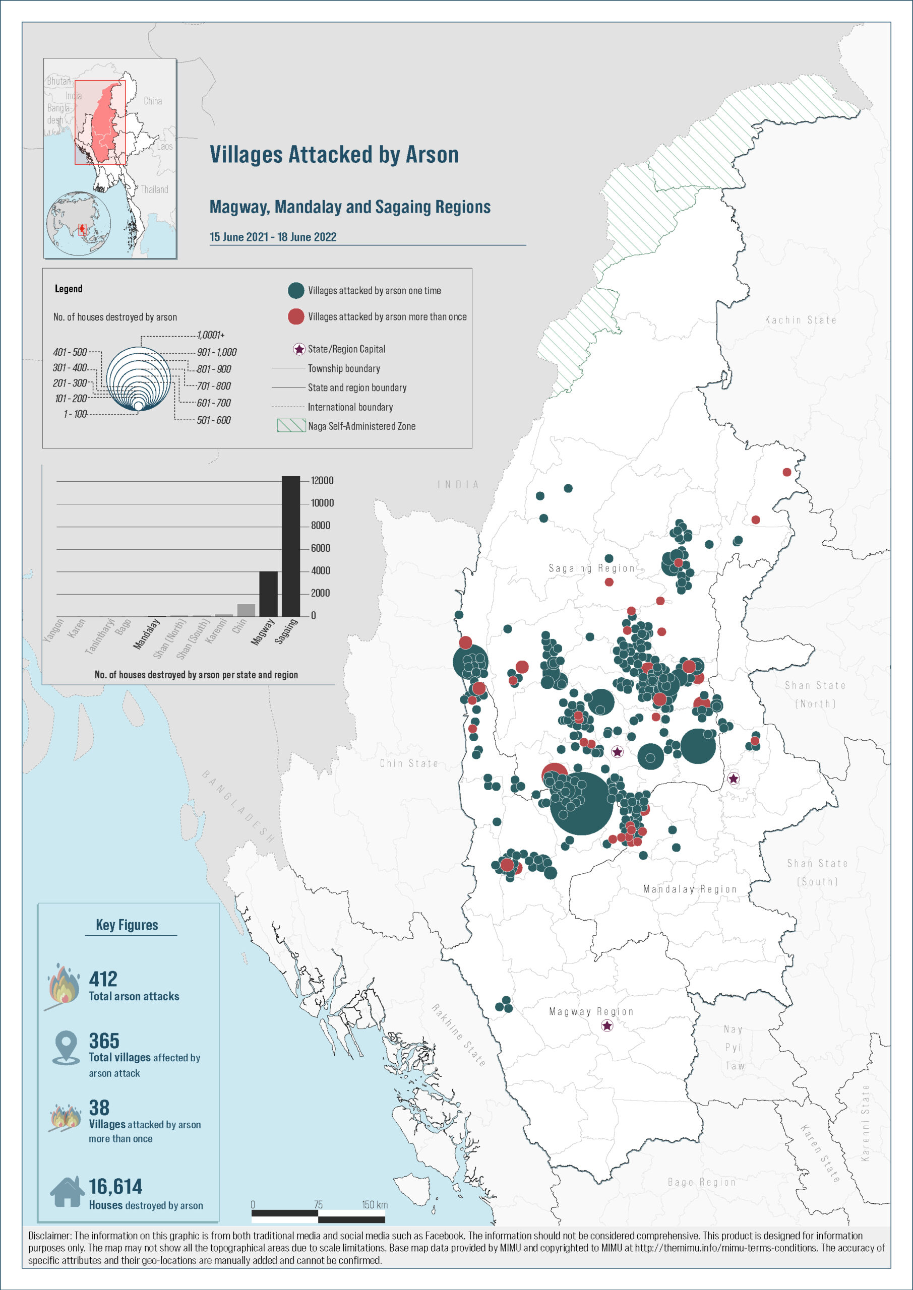 [41] According to the independent organisation Data for Myanmar, the SAC has burnt down 18,886 houses across Myanmar since the coup, 13,840 of them in Sagaing Region and 3,055 of them in Magway Region. These figures include fires sparked by shelling and other attacks, as well as targeted arson. See: Data For Myanmar, Facebook post, 7 June 2022, https://www.facebook.com/data4myanmar/posts/1633821856986013.