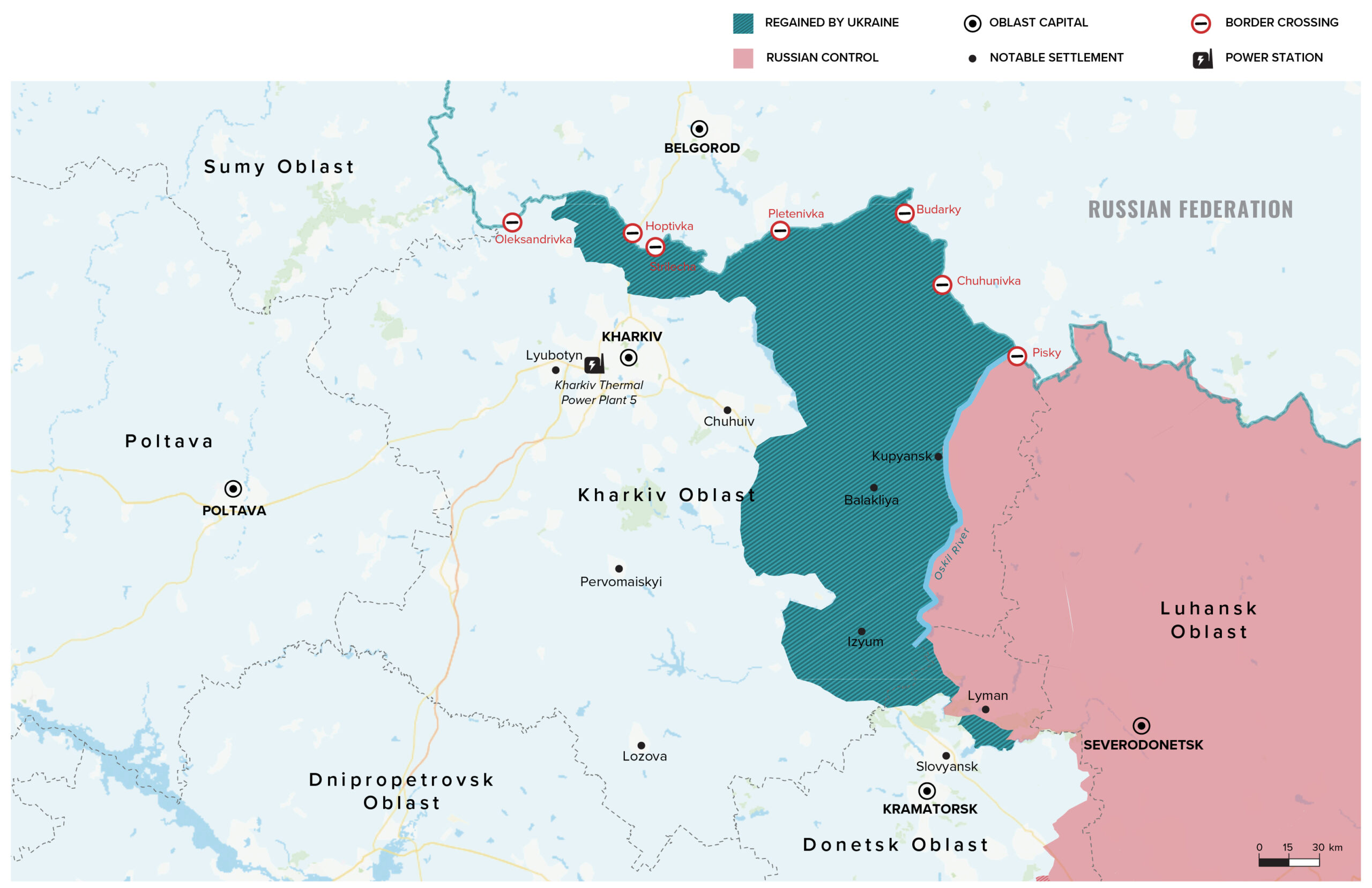 Kharkiv oblast is located in eastern Ukraine and is the country’s third-most populous region, with a 2021 population of over 2.63 million. It is bordered by Sumy oblast to the northwest, Poltava oblast to the south, Dnipropetrovsk oblast to the southwest, Donetsk oblast to the southeast and Luhansk oblast to the east, as well as Russia’s Belgorod oblast to the north. Kharkiv city, the regional capital and one-time capital of Soviet Ukraine, is Ukraine’s second largest city (2021 pop. approximately 1.43 million) and a major industrial, educational, and cultural hub. It hosts the famous Malyshev factory, which produces mining, agricultural and military equipment, and many other facilities that manufacture electronics, turbines for power generators, aircraft parts and components for nuclear plants. Notable Kharkiv oblast cities and towns include Izyum, Chuhuiv, Balakliya, Lozova, Kupyansk and Pervomaiskyi. As of mid-September, the Oskil river in the region’s east divides Ukrainian and Russian positions.