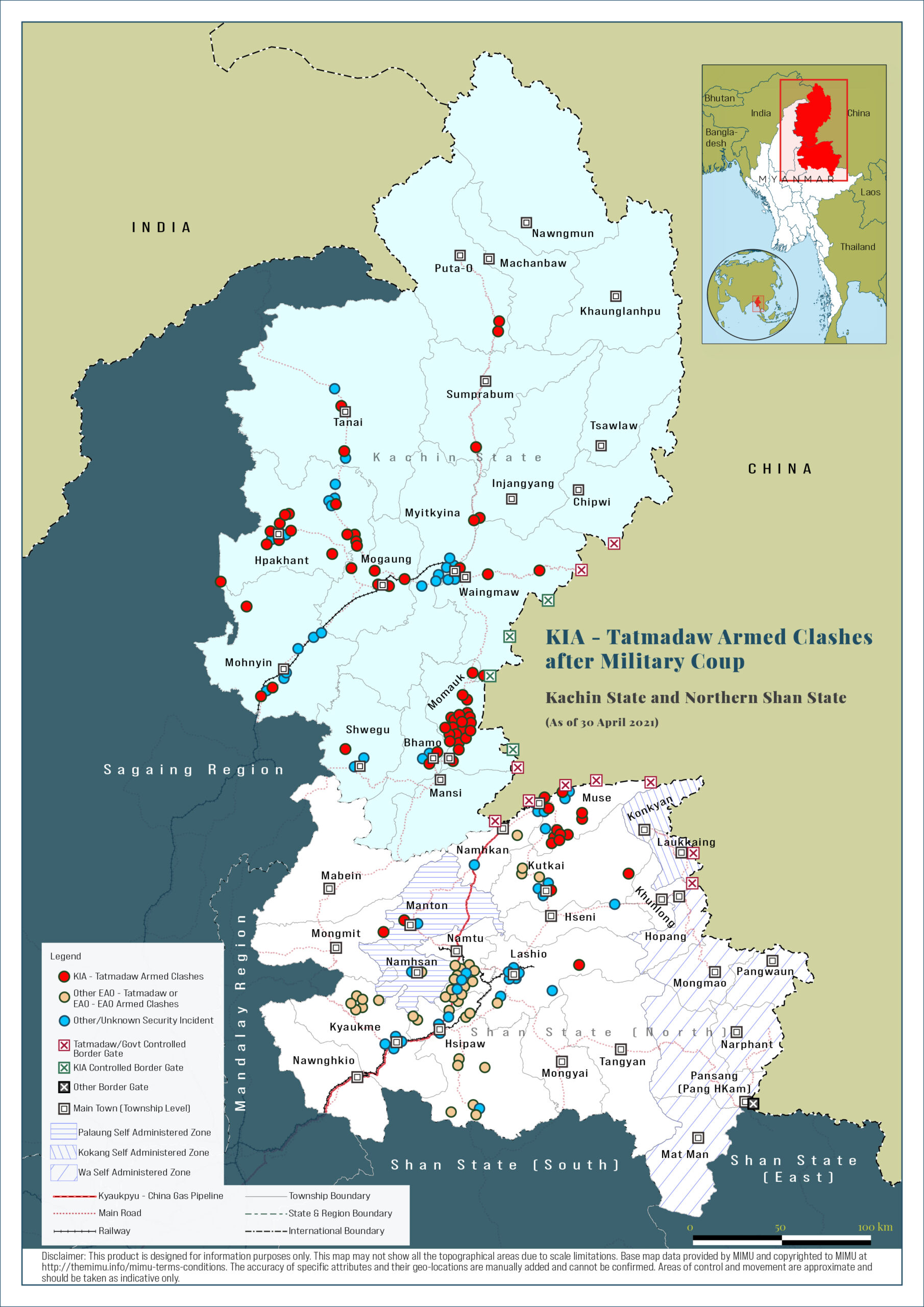 Frequent armed confrontations between the Tatmadaw and the KIA are being reported across Kachin State, from Hpakant to Tanai, Injanyang, Kamaing, Mogaung, Namti, Puta-O, Sadaung, Sein Lum, Sumprabum, Waingmaw, and Shwegu townships and sub-townships. In Tanai Township, the KIA torched a building and vehicles belonging to Yuzana Company – known for its close ties with senior regime and former military leaders. On 28 March, it was reported that the KIA had attacked and killed over 30 Myanmar security forces who had taken refuge inside jade mines. The KIA has warned of retaliation in urban areas if security forces continue to harm anti-coup demonstrators. The KIO is embracing the CDM, providing demonstrators with basic military training and inviting Myanmar military members to join the KIA if they do not wish to serve the junta.